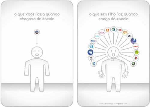 Bem nos tempos modernos isso está mudando e o entretenimento dos jovens está ficando totalmente digital com o uso do Youtube, Orkut, Flickr, Skype, TV a Cabo e muito mais, que as vezes além de divertir auxilia na educação dos jovens… Vejam a seguir uma charge que mostra essa realidade dos jovens aqui no Brasil!